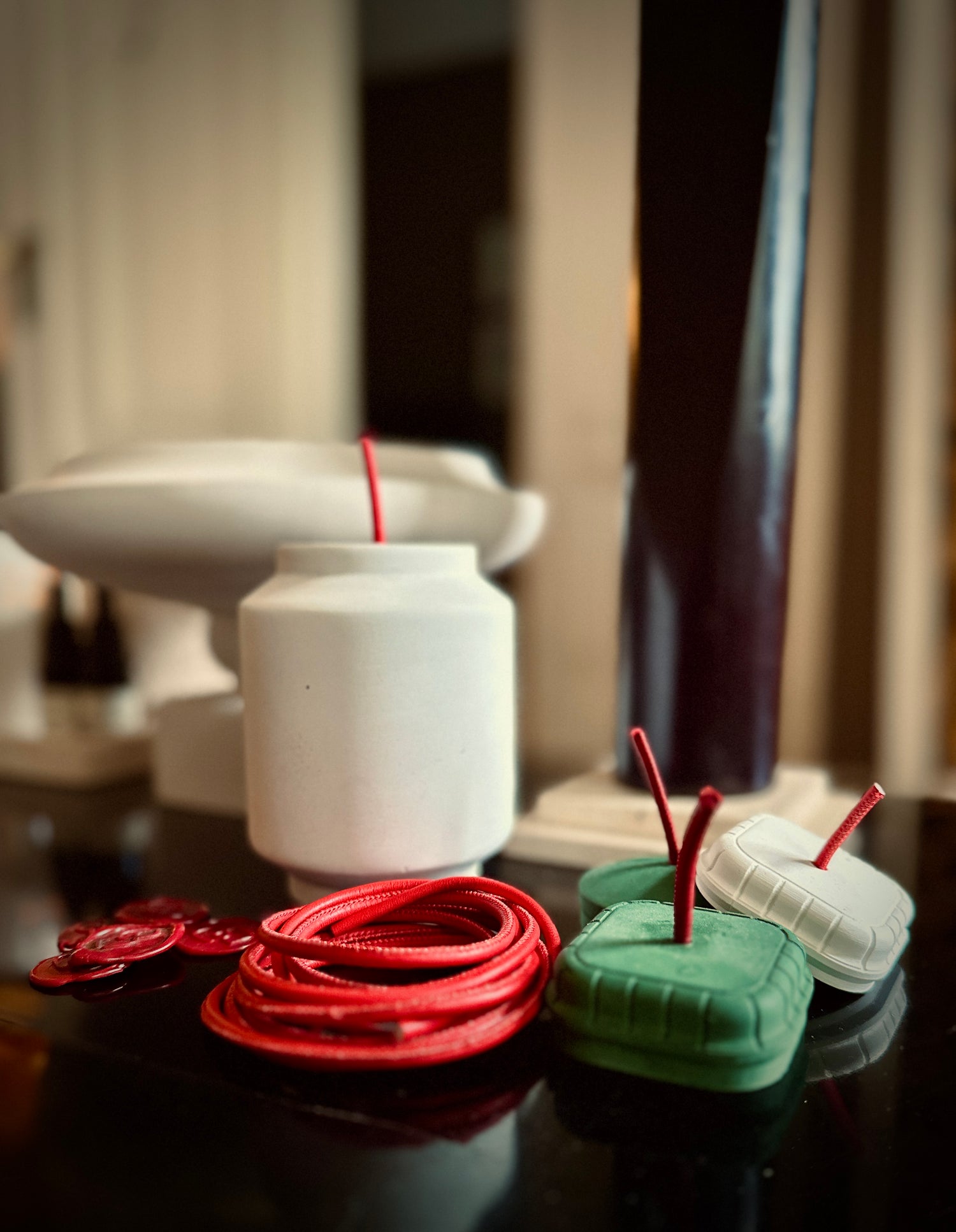 Die Objekte erhalten eigene Deckel. Sie sollen dadurch ihre ursprüngliche Form auch während des Abbrennen der Kerze bewahren. Sie bewirken, dass die Skulptur als ästhetisches Kunstwerk bestehen bleibt. Ein falscher Docht aus rotem Kunstleder läßt die Kerze als solche erkennbar bleiben.